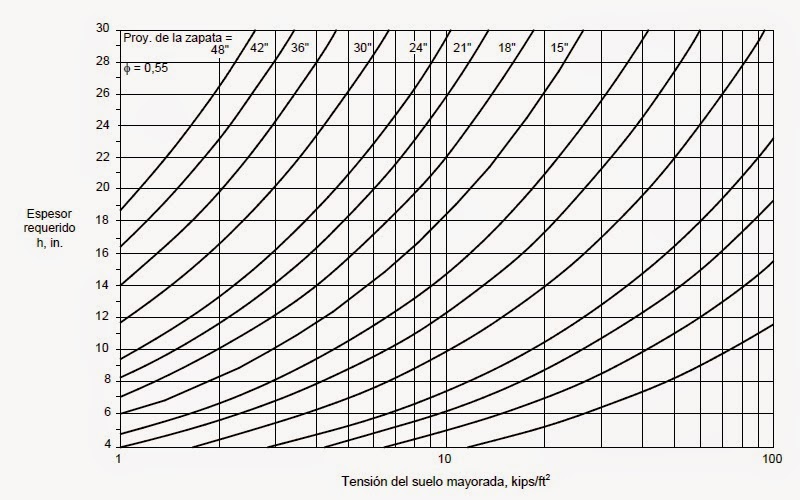 Para las zapatas que soportan columnas, pedestales o tabiques de hormigón, si la proyección de la zapata más allá de la cara del elemento soportado es menor o igual que el espesor de la zapata, h, no es necesario verificar el corte en una dirección ya que la sección crítica para el cálculo del corte está fuera de la zapata. En aquellos casos en los cuales es necesario considerar el corte en una dirección (comportamiento como viga) se deben satisfacer los requisitos de la Ecuación (22-9). Además, para las zapatas que soportan columnas, pedestales u otras cargas concentradas, si la proyección de la zapata más allá de la sección crítica es mayor que h/2 es necesario verificar si se satisfacen los requisitos de la Ecuación (22-10) correspondientes a corte en dos direcciones (punzonamiento). Generalmente el diseño del espesor de una zapata de hormigón simple será determinado por la resistencia a flexión; sin embargo, el ingeniero no debe descuidar la posibilidad de que el diseño sea controlado por el corte en una o en dos direcciones. Se debe recordar que los requisitos del artículo 22.4.8 establecen que para los elementos de hormigón simple colocado directamente sobre el terreno el espesor, h, usado para calcular las resistencias a flexión y corte es el espesor total menos 2 in. En consecuencia, para una zapata que tiene un espesor total de 8 in. (valor que corresponde al mínimo espesor total permitido por el artículo 22.7.4) para determinar las resistencias se debe usar un espesor, h, igual a 6 in. Algunos códigos de construcción permiten utilizar zapatas de 6 in. de espesor para estructuras residenciales y otras estructuras pequeñas. En estos casos, a los fines del cálculo de las resistencias, el espesor, h, es igual a 4 in. La Figura 30-10 se incluye para ayudarle al diseñador a seleccionar un espesor de zapata que satisfaga los requisitos de resistencia a flexión. A la figura se ingresa con la tensión del suelo mayorada. Luego se proyecta verticalmente hacia arriba hasta la curva que representa la longitud de la parte de la zapata que se proyecta más allá de la sección crítica donde se debe calcular el momento (ver Tabla 30-3). Para determinar el espesor mínimo requerido para la zapata se debe leer horizontalmente hacia la izquierda. A este valor se le deben sumar 2 in. Los espesores indicados en la figura se basan en una resistencia a la compresión especificada del hormigón f'c de 2500 psi. Si se utilizan hormigones de mayor resistencia está permitido reducir este espesor multiplicándolo por el factor: (2500/resistencia a la compresión especificada del hormigón)0,25 Debido al exponente que contiene la expresión anterior, un gran aumento de la resistencia del hormigón representa apenas una pequeña disminución del espesor de la zapata. Por ejemplo, si se duplica la resistencia del hormigón el espesor sólo se reduce un 16 por ciento.